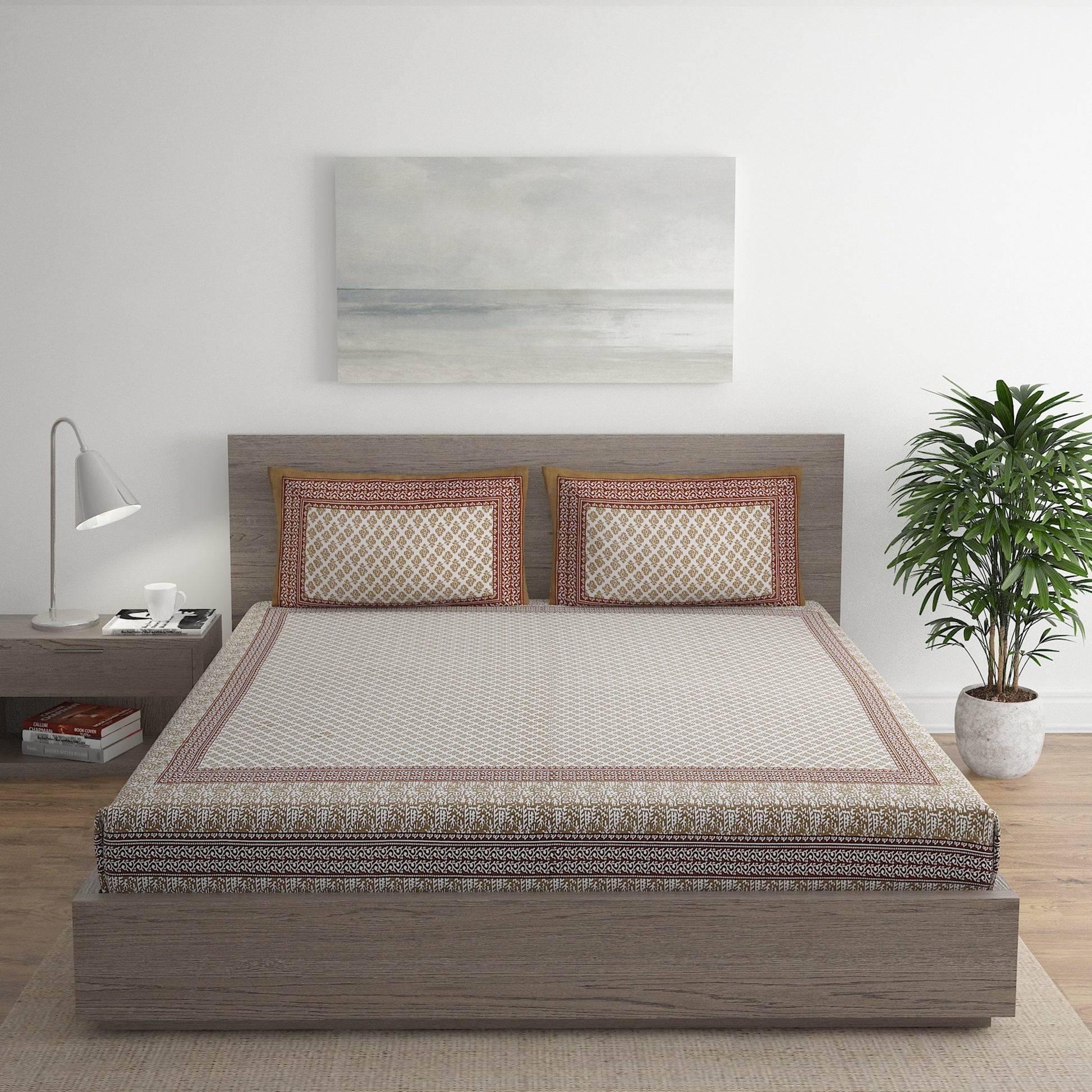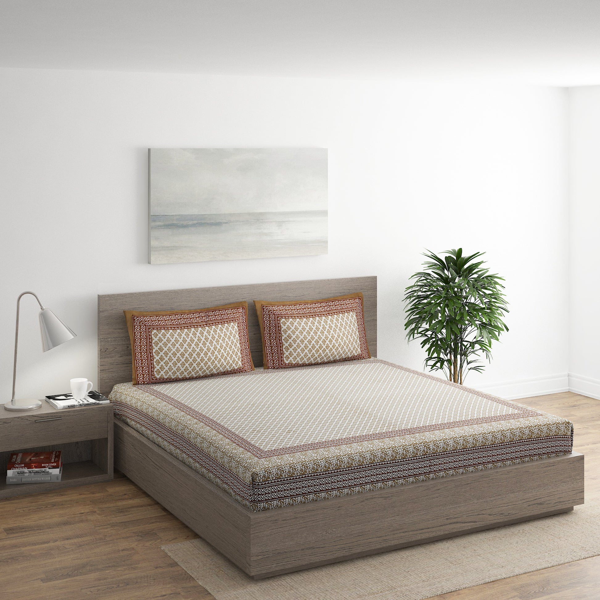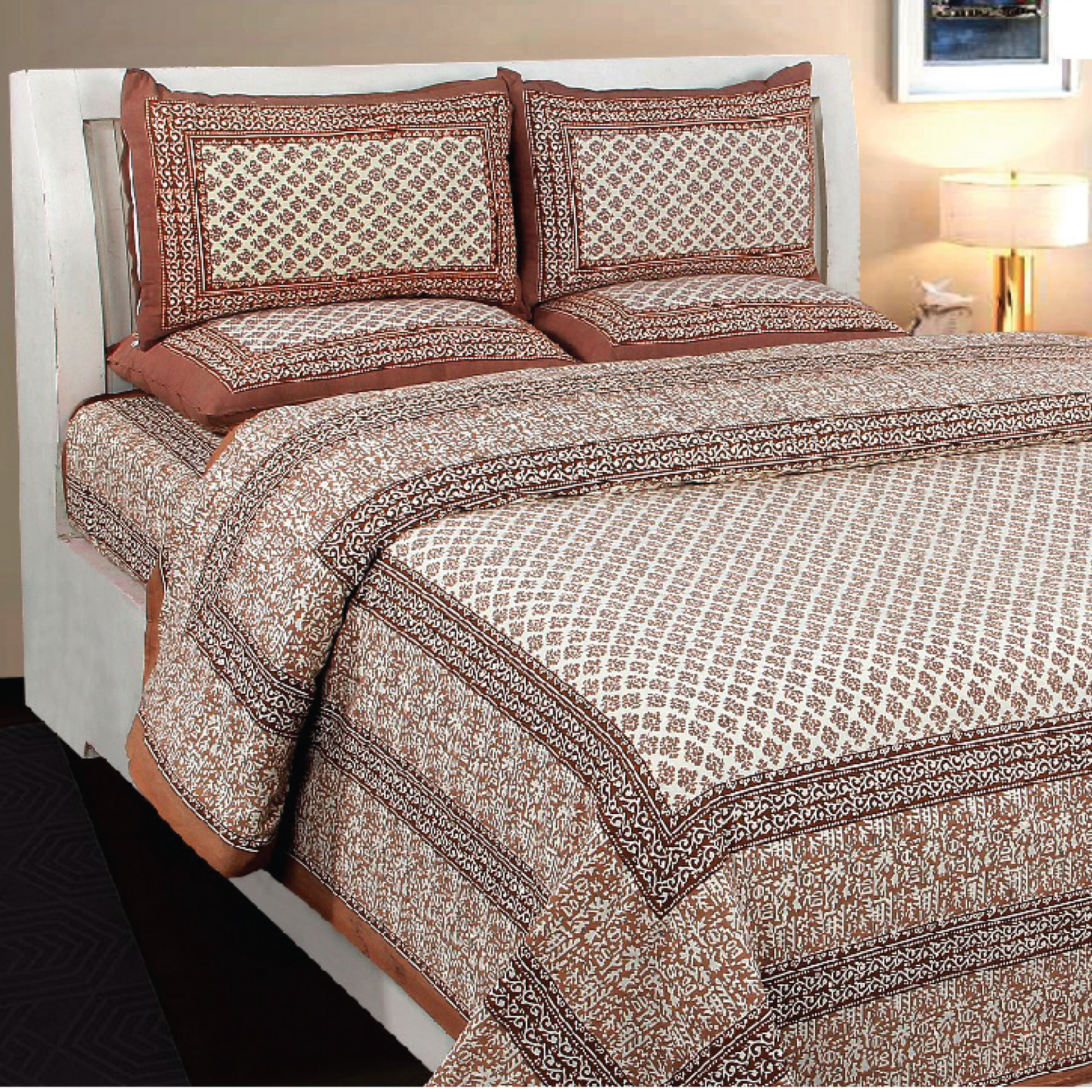 This timeless bedsheet set features an elegant beige base beautifully adorned with delicate Mughal-inspired brown floral block prints and an intricately patterned border, bringing a warm and earthy sophistication to your bedroom. Made from 100% soft cotton, it promises lasting comfort, breathability, and a smooth feel for everyday luxury.