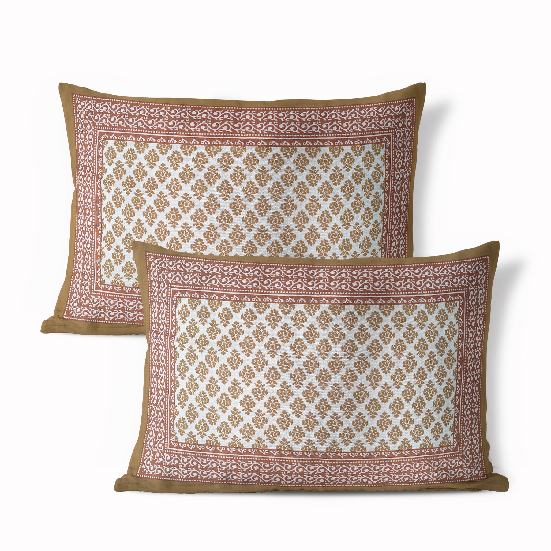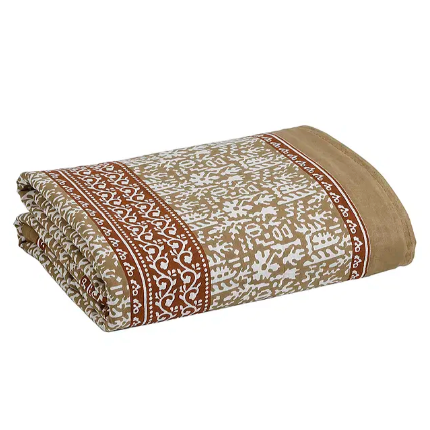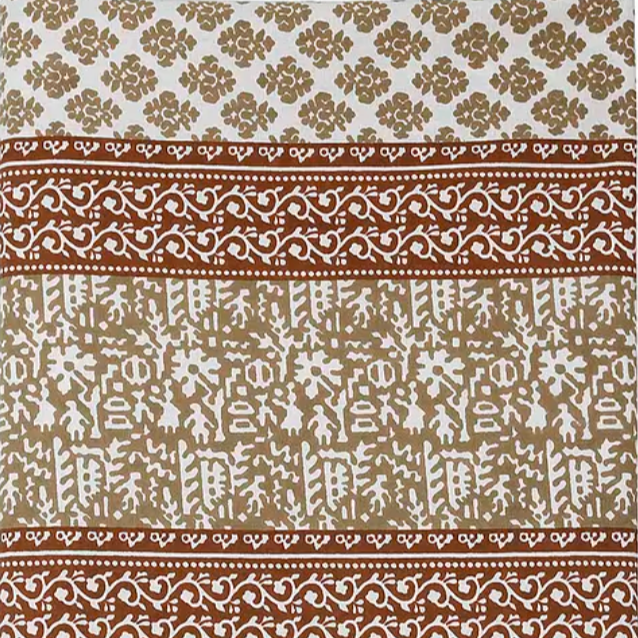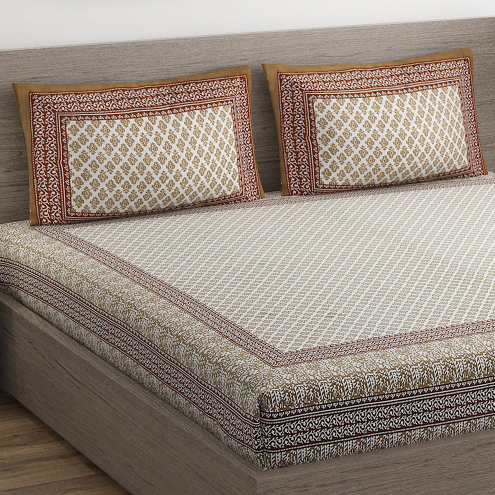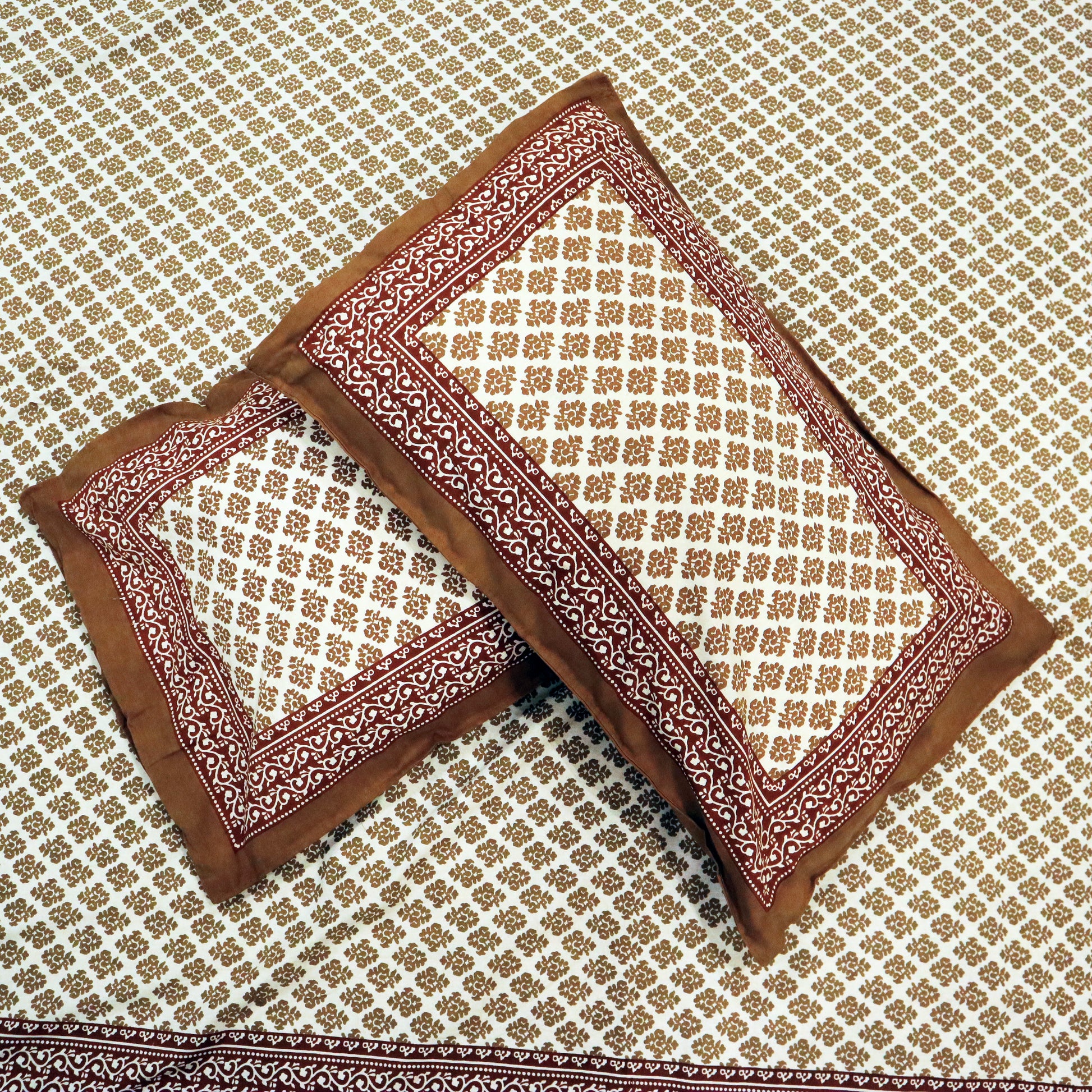 This timeless bedsheet set features an elegant beige base beautifully adorned with delicate Mughal-inspired brown floral block prints and an intricately patterned border, bringing a warm and earthy sophistication to your bedroom. Made from 100% soft cotton, it promises lasting comfort, breathability, and a smooth feel for everyday luxury.