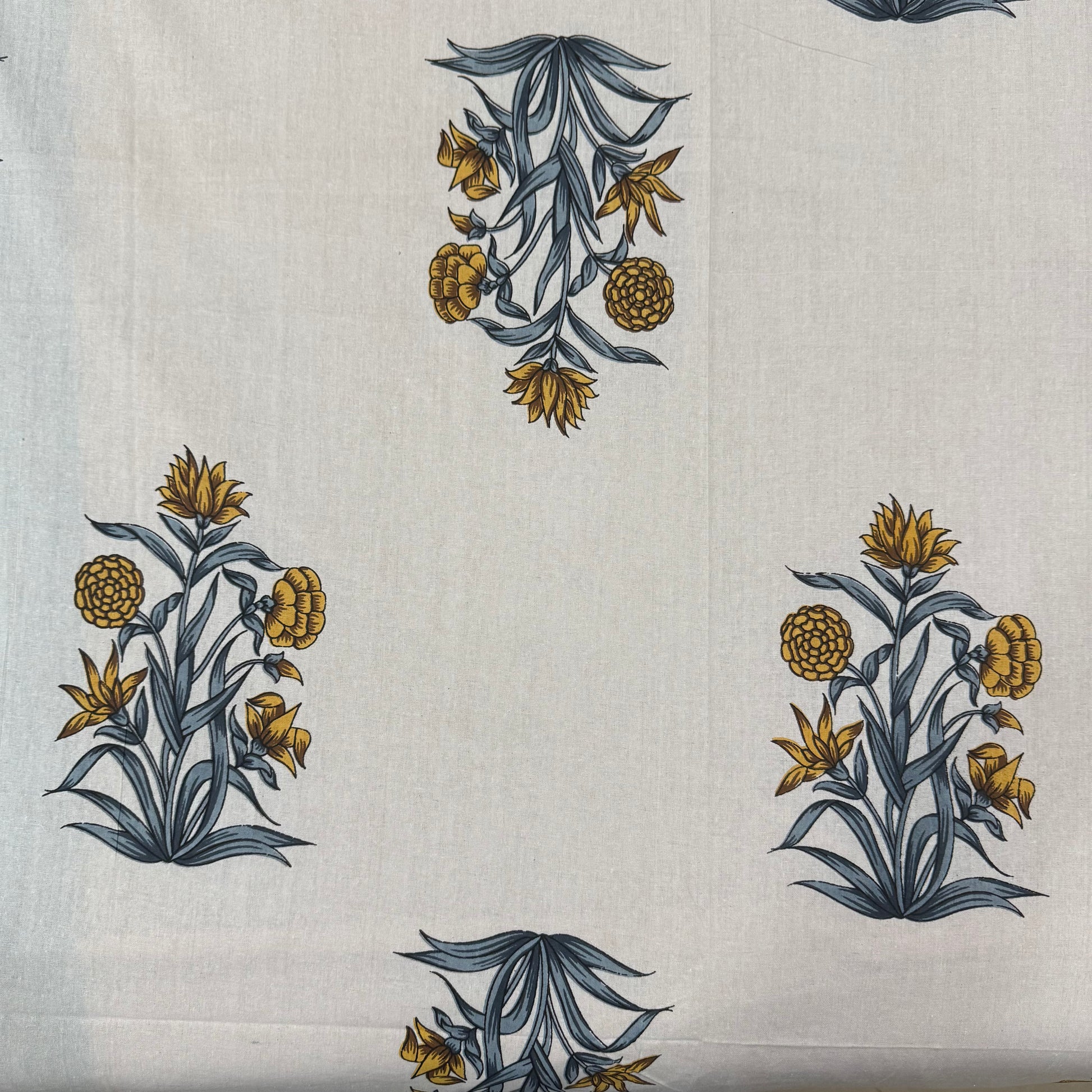 Bring timeless elegance to your bedroom with the Golden Sunlit Flora Bedsheet Set. Featuring a crisp white base adorned with mustard yellow and blue floral motifs, this design beautifully balances warmth and freshness. The intricate border frames the bedsheet with traditional detailing, adding a handcrafted charm that instantly uplifts any space.