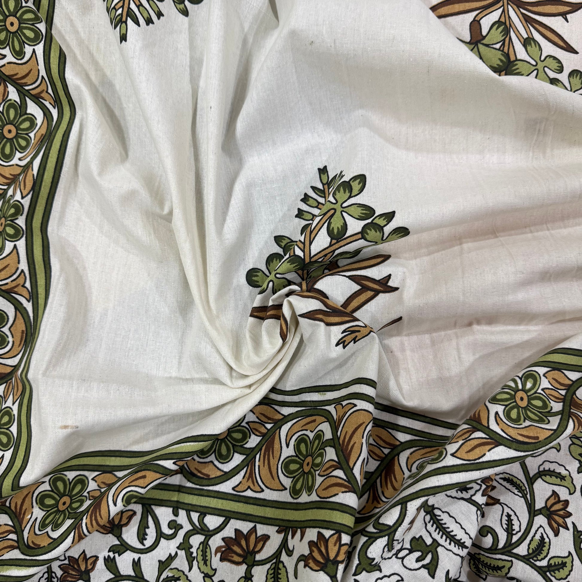 Bring home the soothing essence of nature with the Floral Whisper 100% Pure Cotton Bedsheet. Featuring intricate floral motifs in earthy greens and browns, this design celebrates the timeless artistry of traditional Indian block printing. The lush botanical patterns are gracefully framed with detailed borders, adding a refreshing charm and elegance to your bedroom décor.